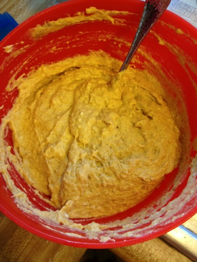 Mix 2 cups of pancake mix, 1/2 of a 15 oz. can of pumpkin, 1 tsp pumpkin pie spice and 1 1/3 cup of water.