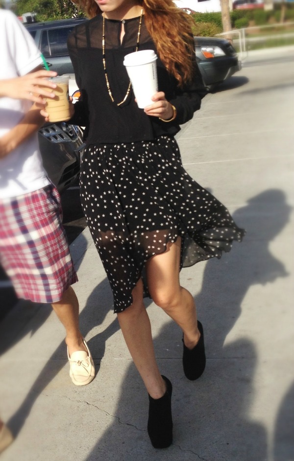 I was able to capture this GORGEOUS outfit at my nearby Starbucks. I love how flowy her outfit is, as well as the tiny stars on her skirt and her super tall ankle boots. In a word it is…perfect.
