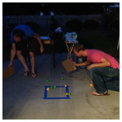 Egg Blow-Contestants have to use a piece of cardboard to get their color Easter Eggs into the blue, taped-off square.