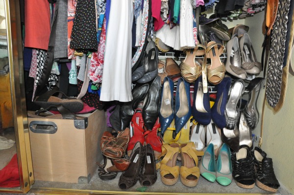 My ginormous shoe collection is shoved into one shoe rack and a box. I also have a box that slides under my bed for boots, as well as the ones I wear most frequently at the top of my closet. My purses or rather large “mom bags” are precariously stacked on one another in a sideways milk carton.