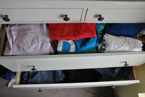 My foldable items are stuffed into two drawers (shirts and pants). If you could see the bottom of the shirt drawer, you’d see that it’s busted out from holding all of that weight.