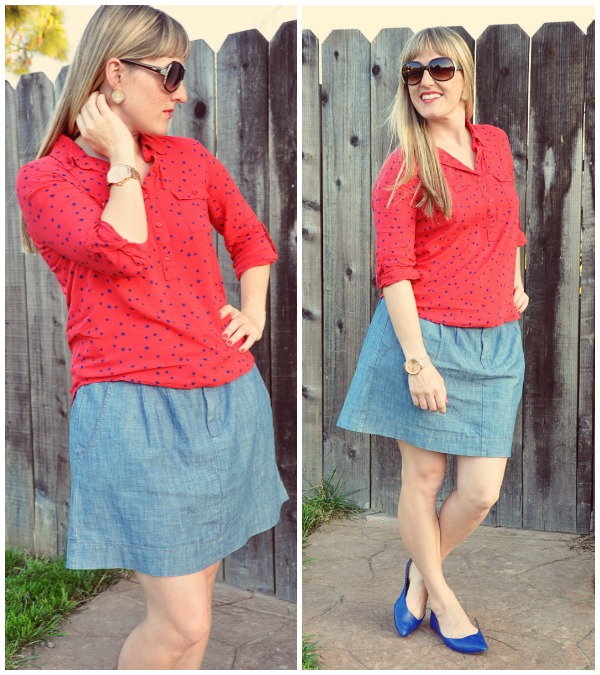 (Sunglasses: Ross (Fossil) Earrings: Goodwill Shirt: Old Navy Watch: Target Skirt & Shoes: Sweet Serendipity)