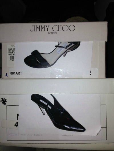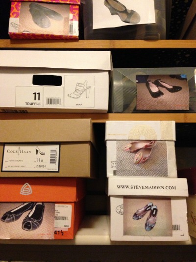 I love shoes. I have boxes and racks for each pair: about 35 pairs last count. I take a photo of each pair and put it on the box for reference because for the first time ever I have choices!
