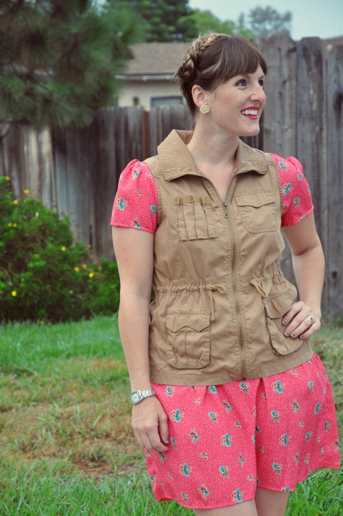 When I went inside, I realized I was so out of it, that I hadn’t even put earrings on. I quickly found some I liked and then remembered how I don’t like how the bodice of this dress gapes, so I added a brown vest I own. When I looked in the mirror, I liked the resulting outfit so much more than just the dress.