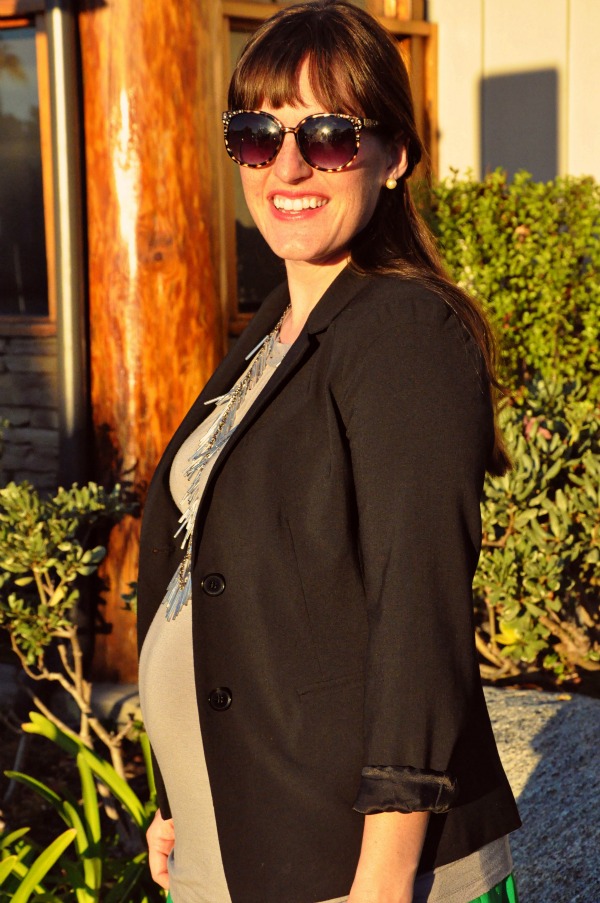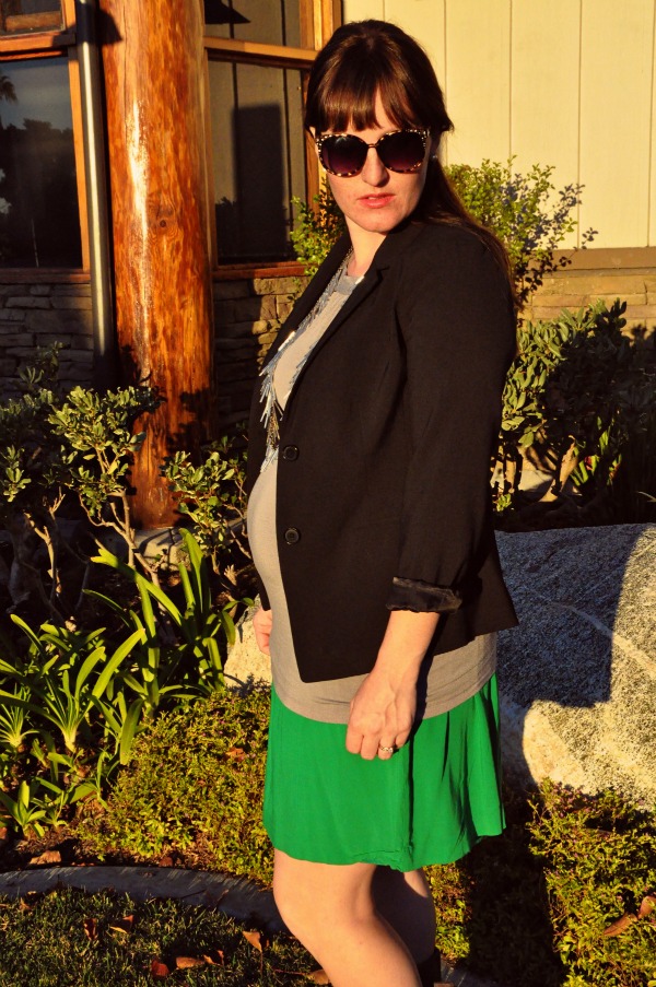 (Blazer & Skirt: GAP Shirt: Old Navy Maternity Necklace: instagram shop Boots: Plato’s Closet)