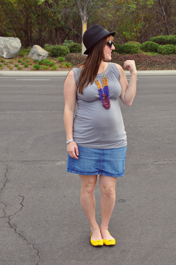 (Hat: Goodwill-F21 Shirt & Skirt: Old Navy Maternity Necklace: Noonday Collection Shoes: Ross)