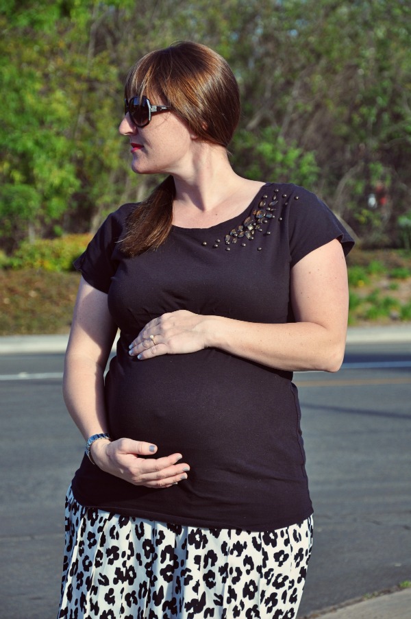 (Headband (actually a belt): Plato’s Closet Pearl Necklace: Cookie Lee Rhinestone Necklace: instagram shop Dress: Old Navy Maternity Shoes: Goodwill)