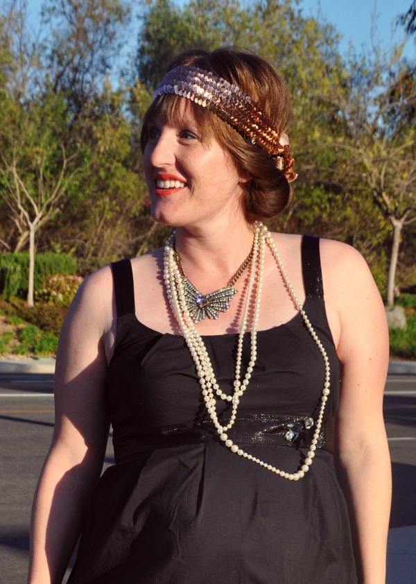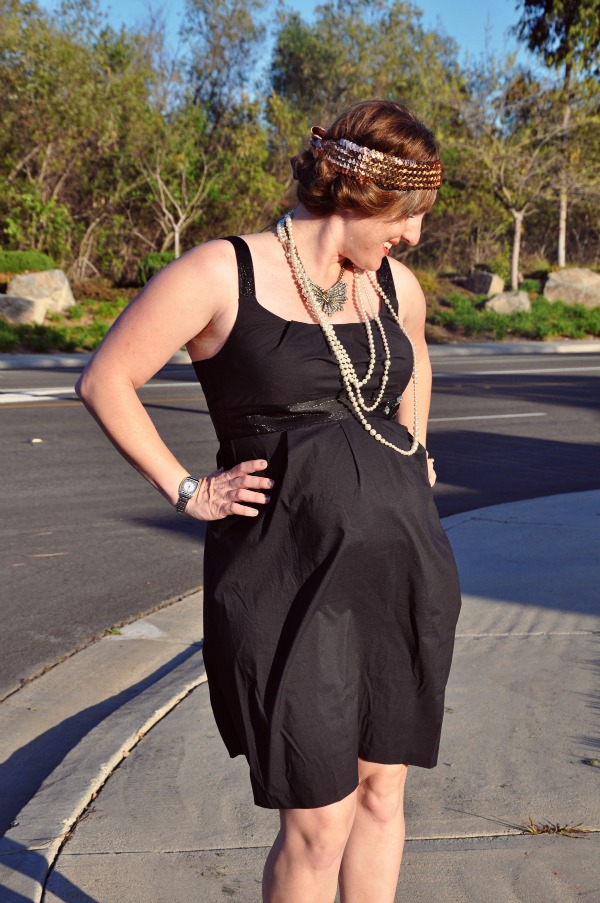 My husband’s grandmother turned 90 this past week and we had a “Roaring 20’s” party for her. Flapper dress was suggested, but since I am 7 1/2 months pregnant, I kind of laughed at the idea. And since it was held on Friday night (the night where I’m basically out like a light at 7pm), I highly doubted that I could pull anything together. I did my best with what I had in my closet and it really helped me get in the party mood and I successfully stayed away until 9pm. SELF HIGH-FIVE!