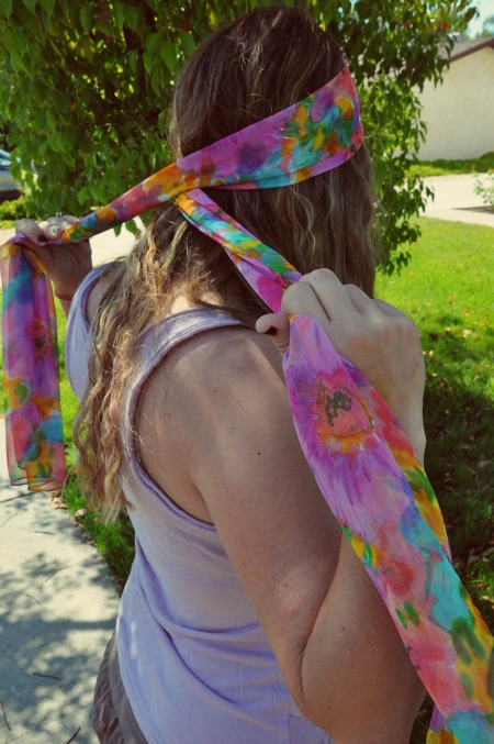 All you need is a scarf (or long piece of fabric) and a hair clip. If you’re clever, you could probably get the same effect with a hairband or bobby pins.
