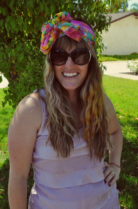 Tie in a knot or bow at the top of your head a little off to the side. Looks good just like this, right? I would agree if it was Fall, but my neck is screaming at me that it’s hot, so let’s continue…