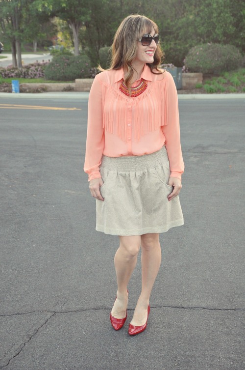 When my son first made this outfit, he paired the lace shirt with a denim skirt that (unfortunately) doesn’t fit me right now. After I told him this, he expertly picked this beautiful dress for me to wear instead. I’m pretty sure my reaction was “Wow! No way, buddy. People are not going to believe that you made this outfit.” But he did. He must have been watching me because this is totally an outfit that I would create. He nailed my style to a T. I’m only a little concerned because he pulled out these shoes and said, “Peach shoes for a peach dress”, even though they don’t match. At least he used the word “peach”? 😉